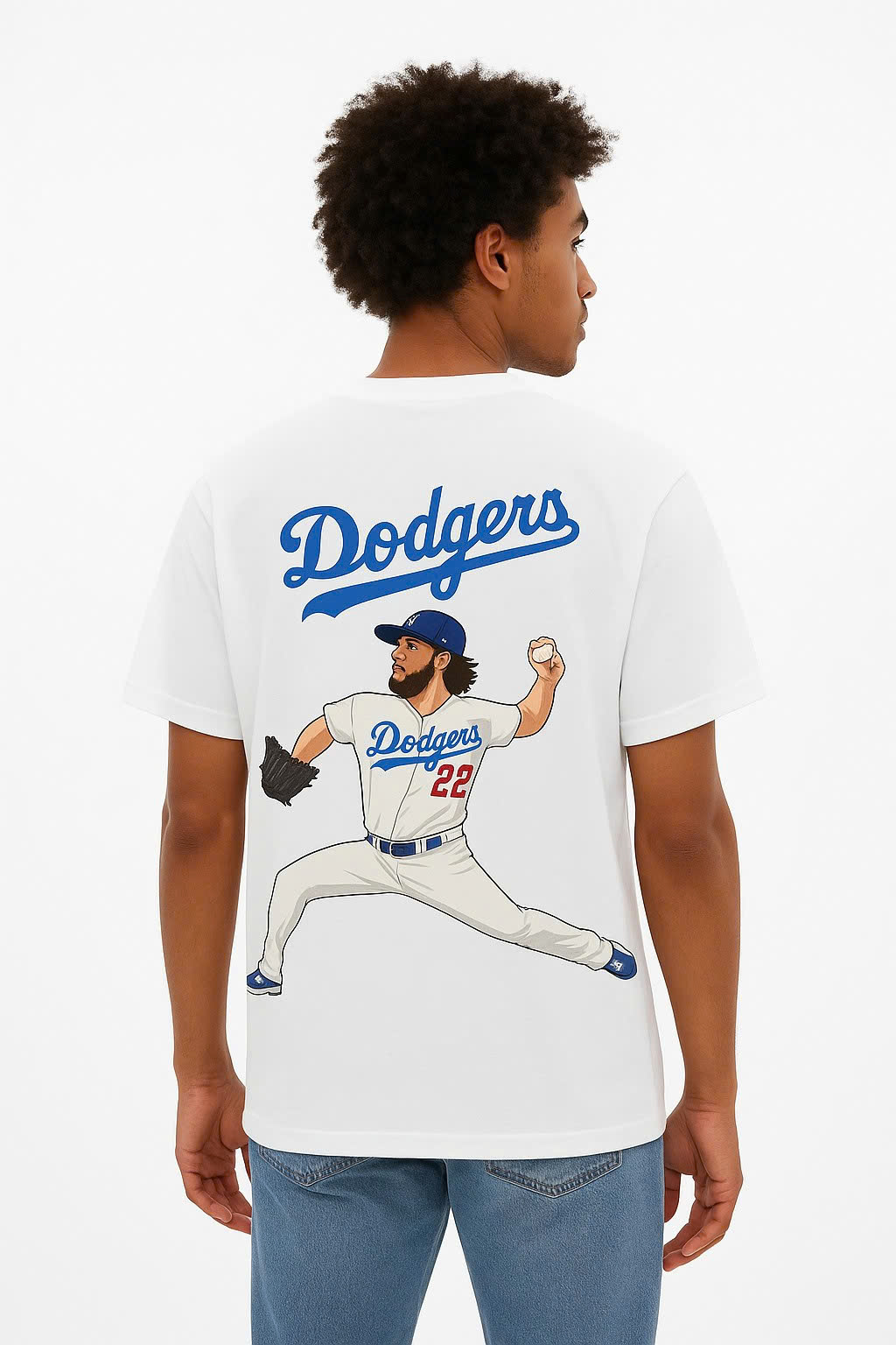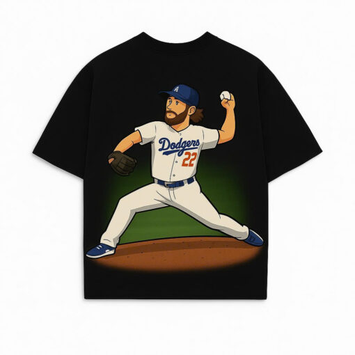 The front of the shirt features the classic Dodgers script logo in bold blue, instantly recognizable to fans worldwide. Turn to the back, and you’ll find a vivid graphic illustration of Clayton Kershaw, mid-pitch in his signature form, wearing his iconic #22 Dodgers jersey. This unique artwork captures the energy and precision that has made Kershaw a multiple-time All-Star, Cy Young Award winner, and World Series champion.