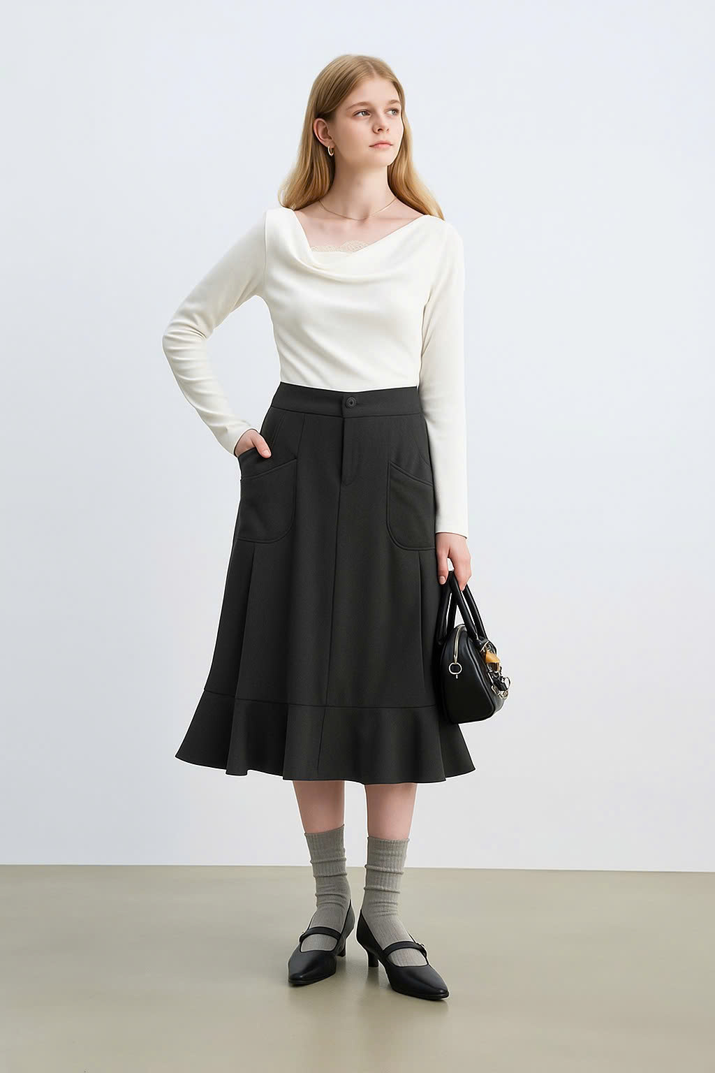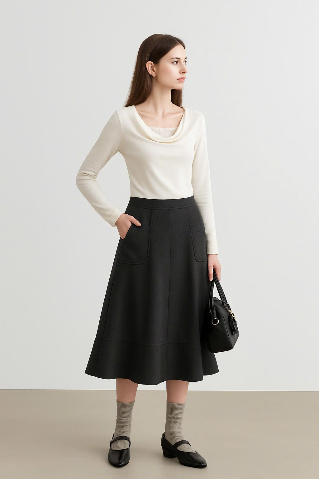 Elegant A-Line Midi Skirt with Pockets – High Waist Flared Hem