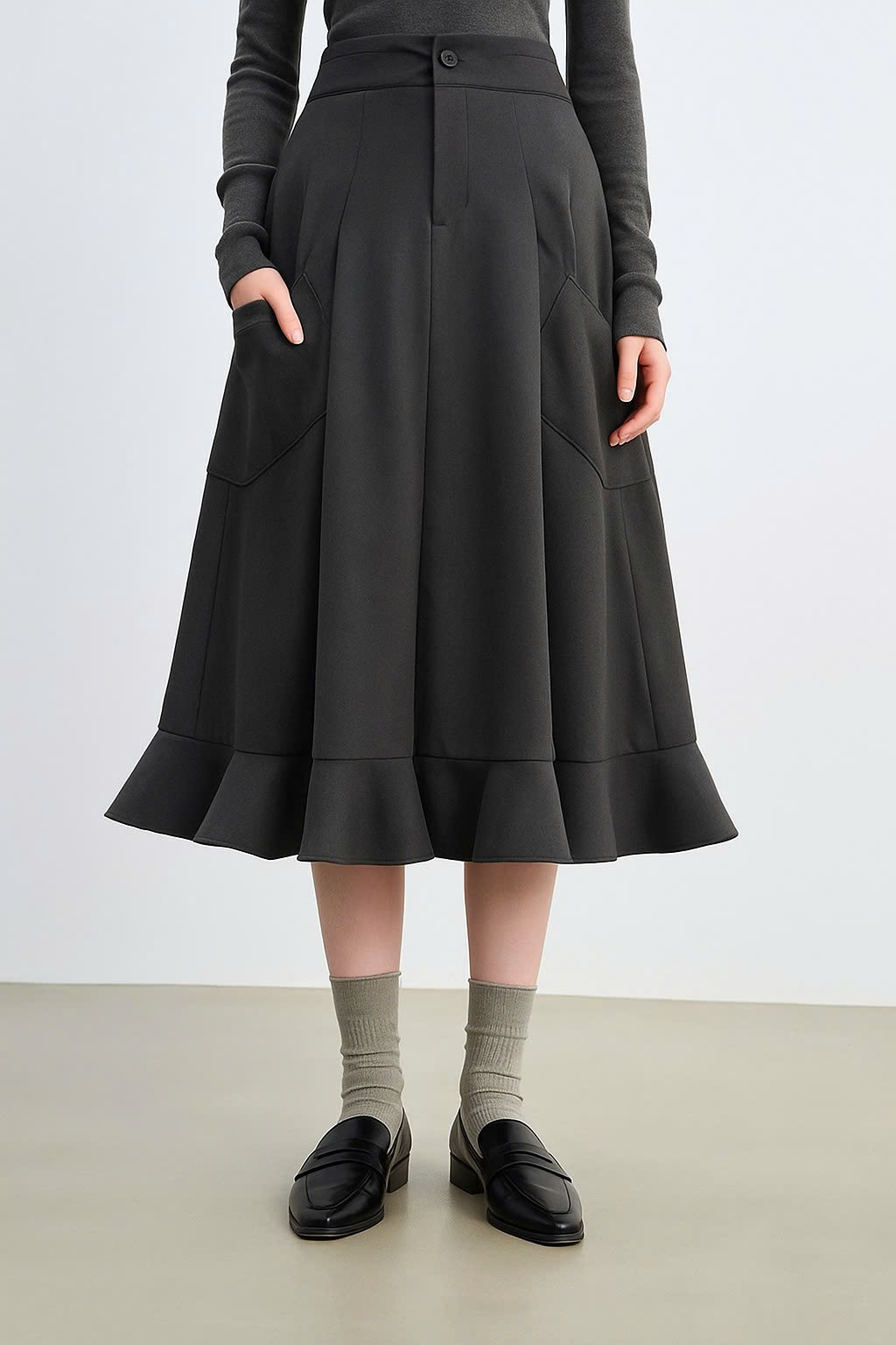 Chic high-waist A-line midi skirt with practical pockets and flared hem, perfect for elegant everyday wear.