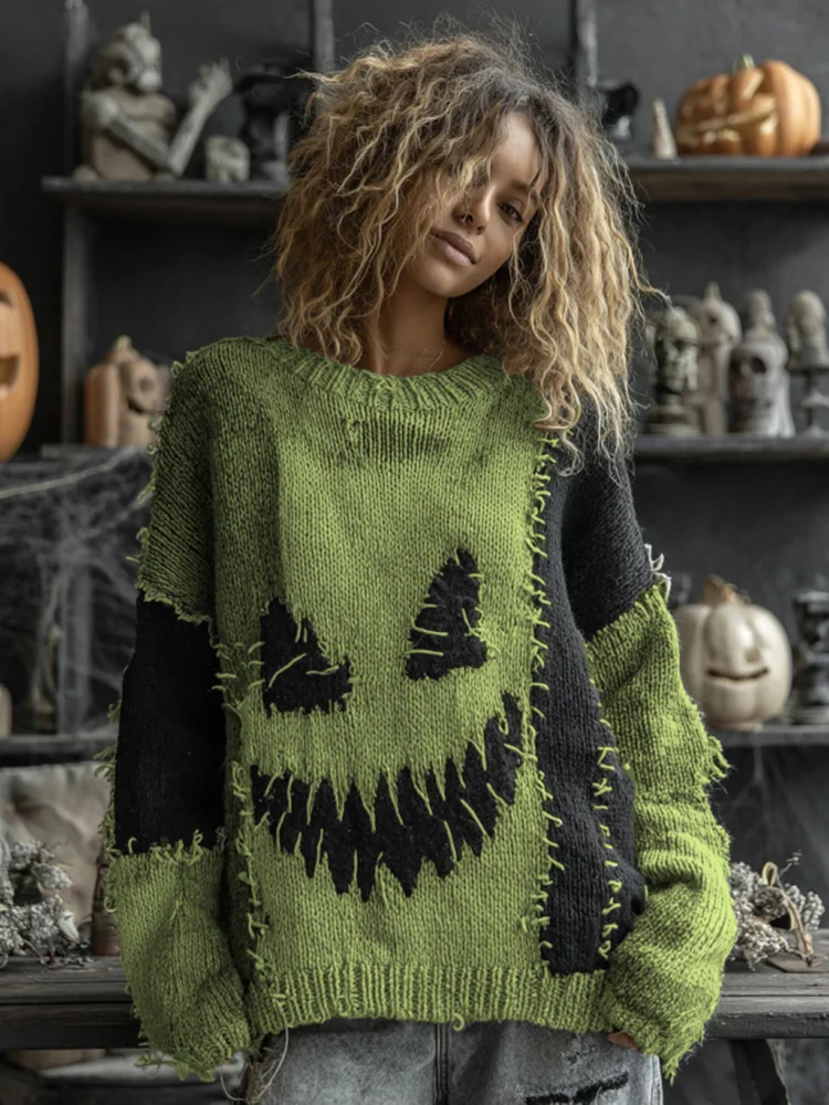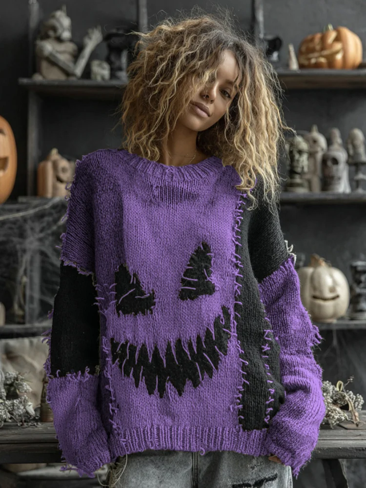 Halloween Cozy Knit Sweater – Spooky Face & Contrast Stitching