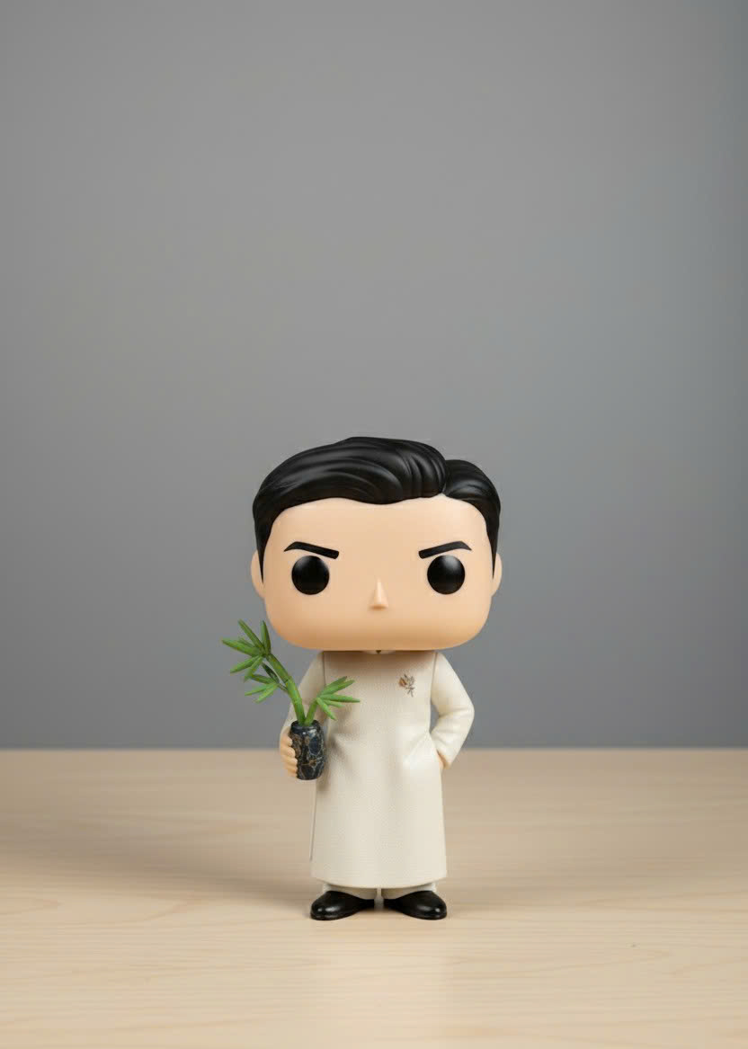 - Nam Nam (No. 1423): With a distinguished and thoughtful presence, Nam Nam is a symbol of strength and tradition. Dressed in a pristine white ao dai, he holds a sprig of lush bamboo, representing resilience, integrity, and enduring vitality in Vietnamese culture. His calm demeanor and classic attire make him a striking figure in this duo.