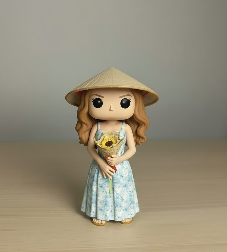 - Nguyen Nguyen (No. 1422): Radiantly poised, Nguyen Nguyen embodies traditional grace. She wears a beautiful ao dai-inspired dress adorned with delicate patterns and a classic nón lá (conical hat). In her hands, she gently holds a vibrant sunflower, symbolizing warmth, happiness, and a bright spirit. Her design captures the serene elegance often associated with Vietnamese women.