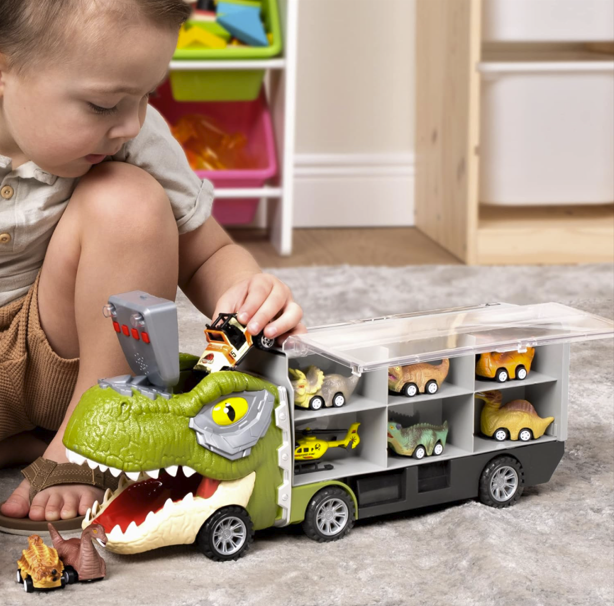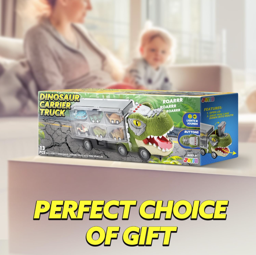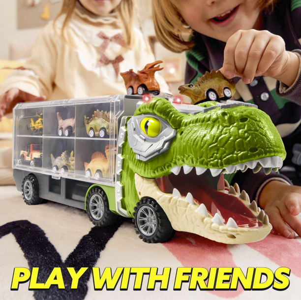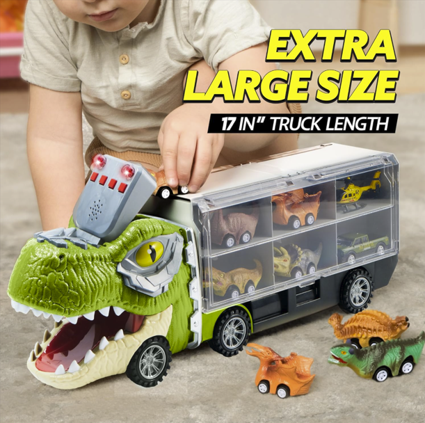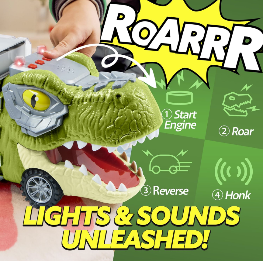 - Realistic Sounds and Lights: The main carrier truck is equipped with 7 simulated sounds, including engine startup, backing up, a dinosaur roar, and an emergency siren. The built-in lights add to the excitement, making the play experience feel incredibly real.