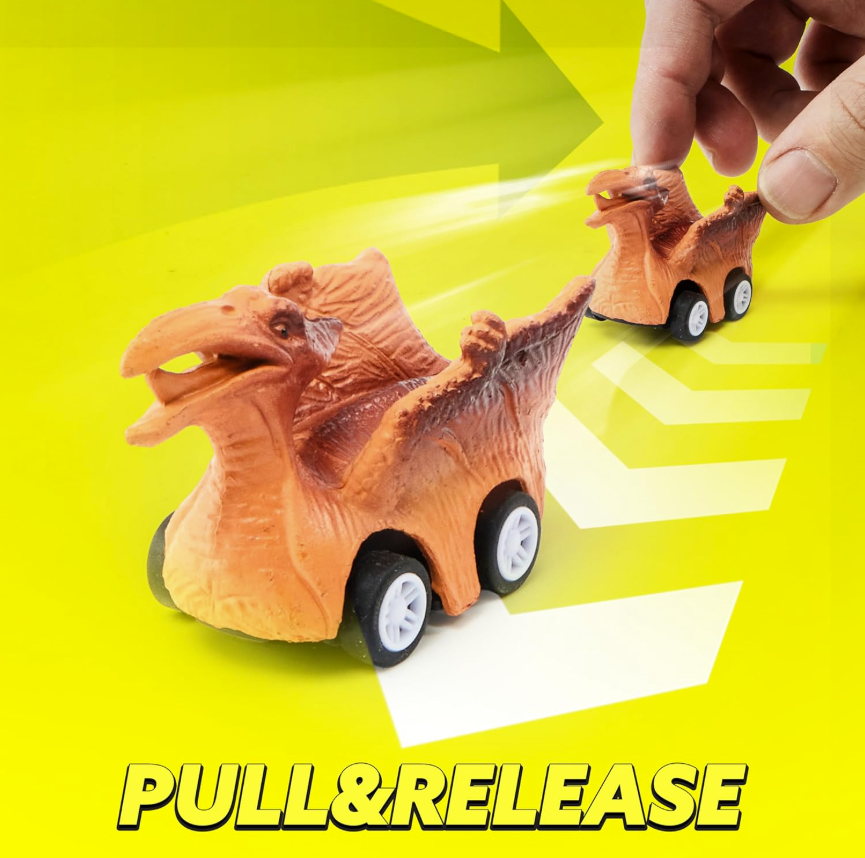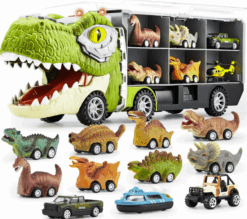 - 13-in-1 Dinosaur Collection: This comprehensive set features 1 large dinosaur carrier truck, 8 mini pull-back dinosaur cars, 3 mini die-cast dinosaur vehicles, and 1 helicopter. All mini vehicles can easily slide in and out of the truck’s front head, which flips open for convenient access.