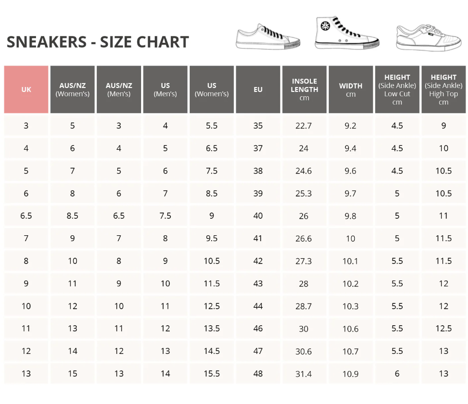 Comes with a detailed international size chart (UK, US, EU, cm) for accurate selection.