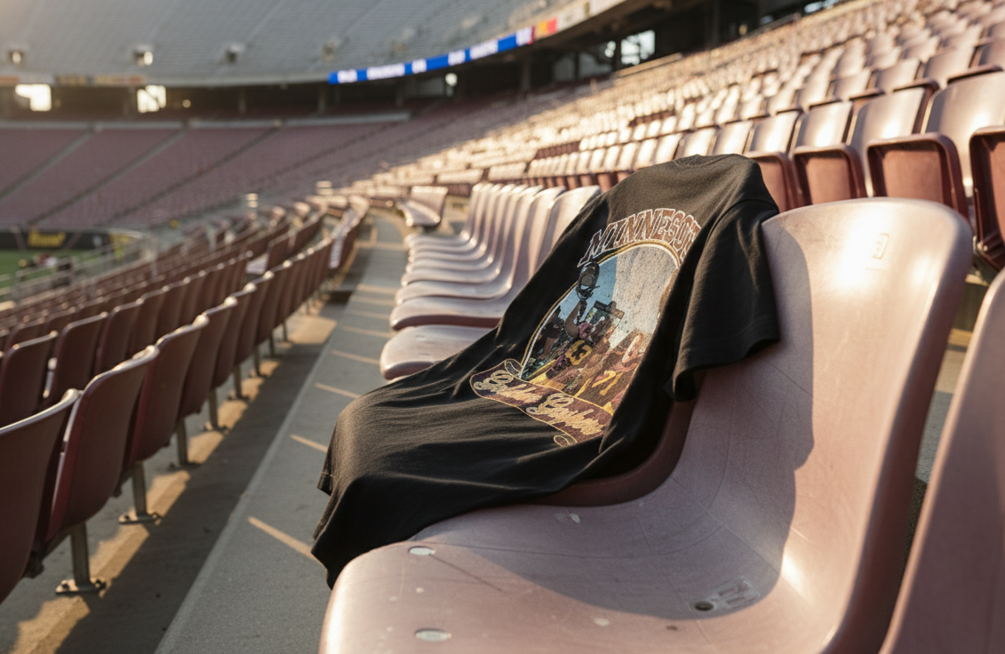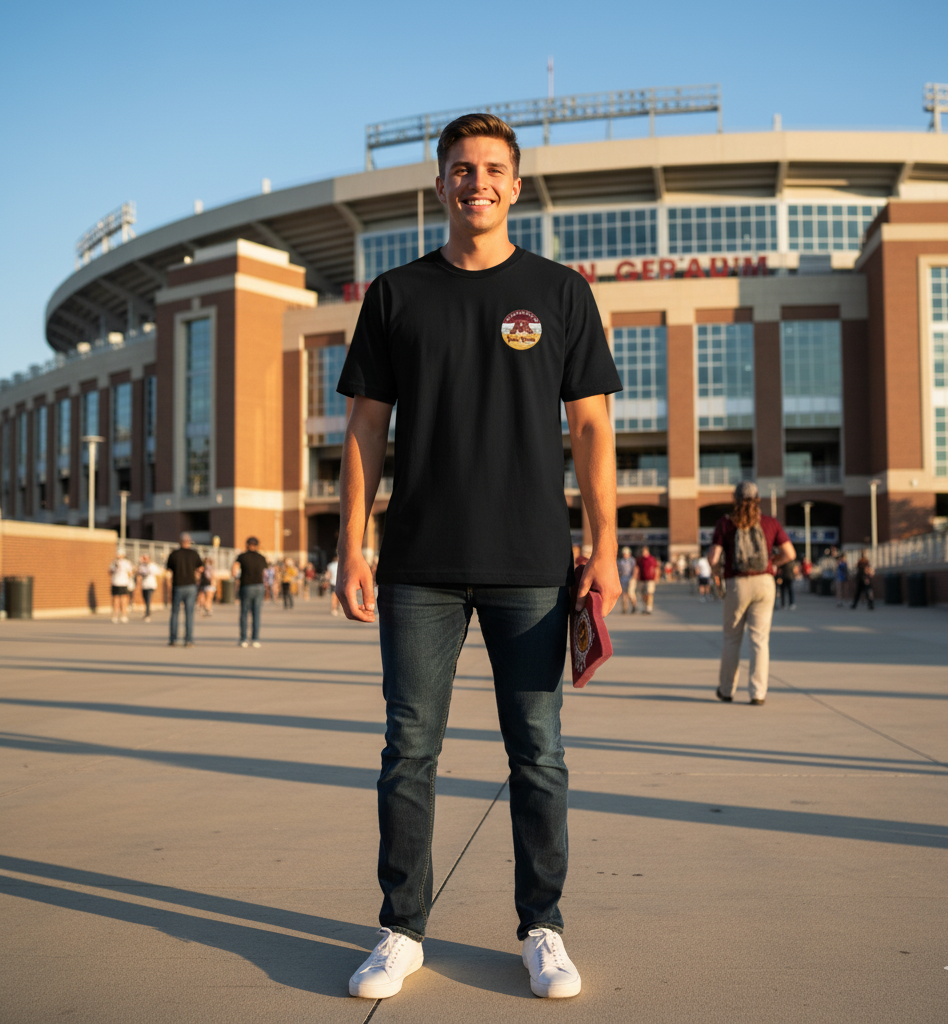 - Back Design: A bold, retro graphic captures the excitement of Minnesota football with a vintage-filtered image of players celebrating on the field, framed by “MINNESOTA” and a “Golden Gophers” banner. The design has a distressed, nostalgic feel.