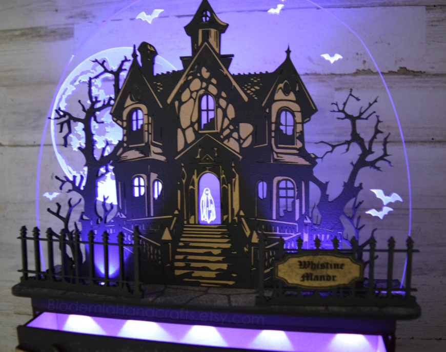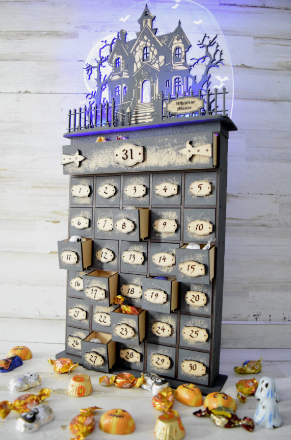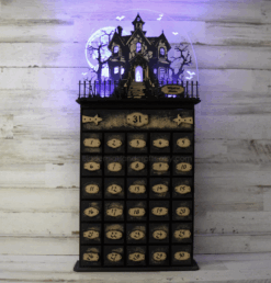 Each calendar features 31 hand-painted drawers, perfect for hiding small candies, trinkets, or surprises. Inside, each drawer reveals a spooky surprise design, adding excitement to your countdown. At the center, the LED light-up acrylic component of your color choice brings the haunted house to life, while the personalized plaque ensures your piece is truly one of a kind.