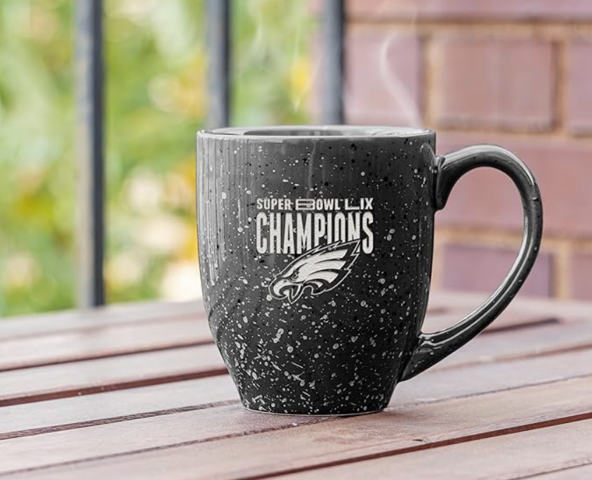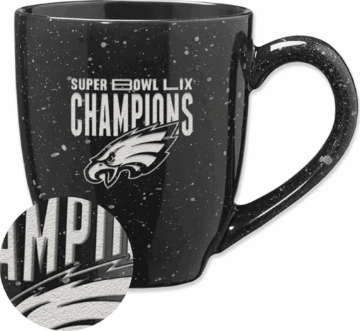 Exclusive & Modern Design: 16 oz ceramic mug in Philadelphia Eagles team colors with Super Bowl LIX Champions 2025 laser-engraved lettering. Each mug is one of a kind, thanks to the special speckled glaze technique that delivers a premium and unique look.