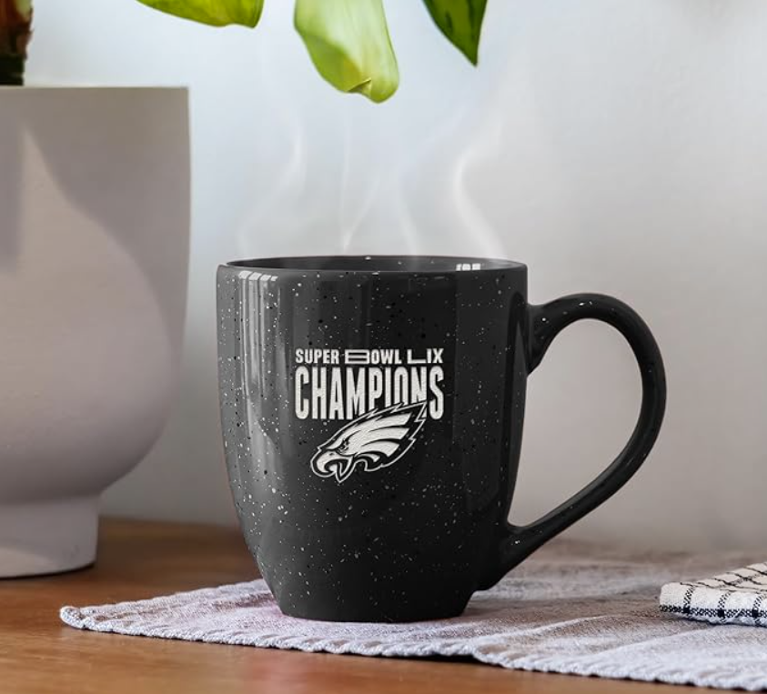 Philadelphia Eagles 16 oz Ceramic Coffee Mug – 2025 Super Bowl LIX Champions edition, featuring a modern design with unique speckled glaze and precision laser-engraved team logo. Officially licensed by Rico Industries, this durable and safe mug comes with a large, comfortable handle, suitable for both hot and cold drinks. A perfect choice for Eagles fans and an ideal gift for friends, colleagues, or loved ones.
