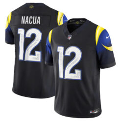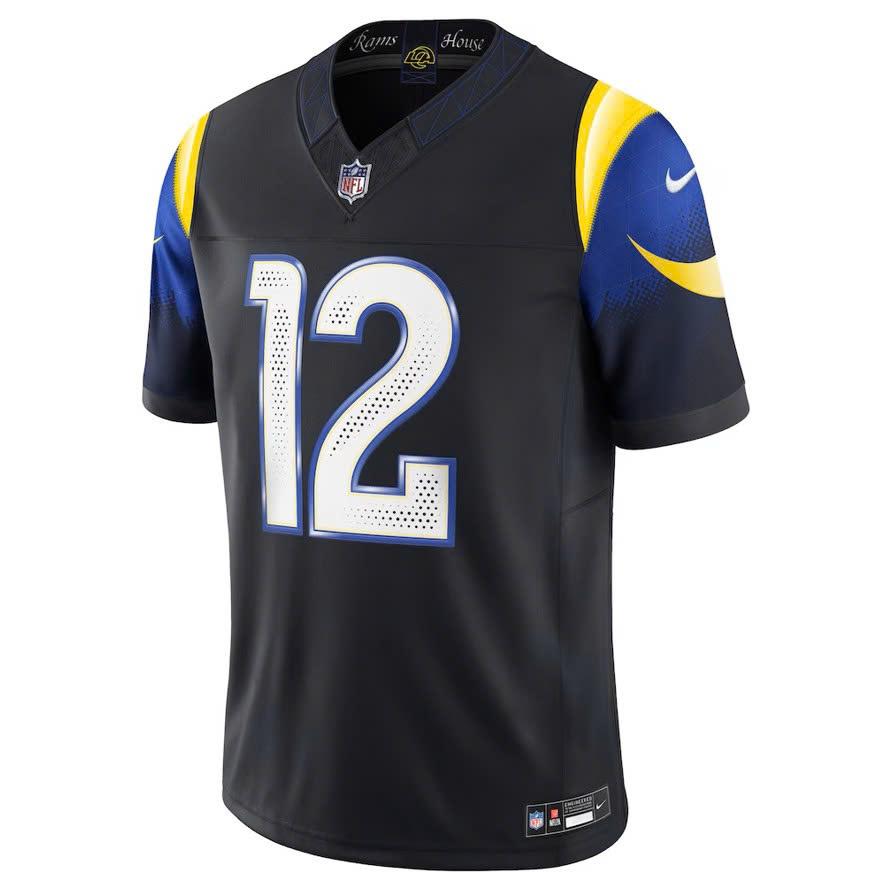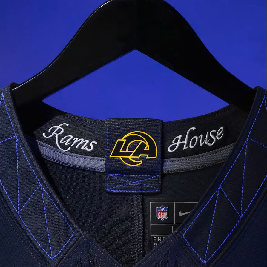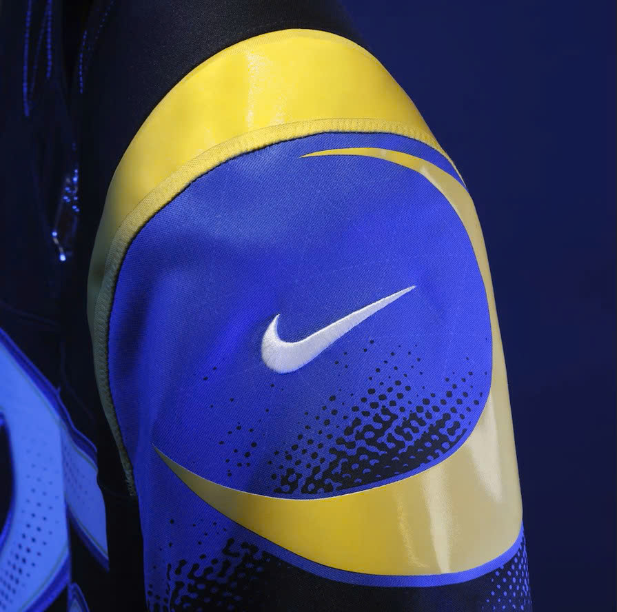 ELECTRIC ENERGY: Shoulder gradients blend Rams blue and vibrant yellow, echoing the dynamic spirit of Los Angeles and the intensity of Pacific rivalries.