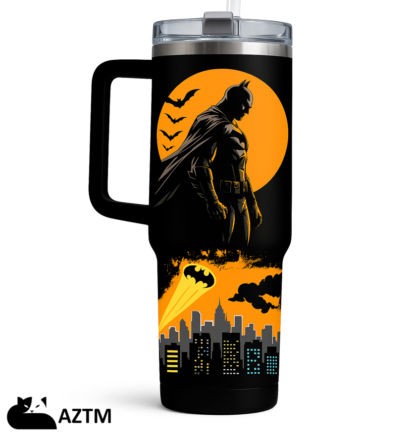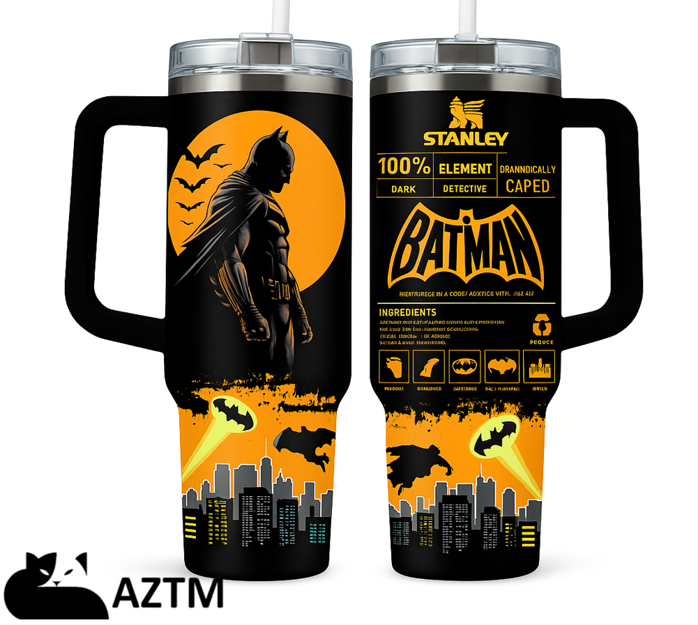 A dark Batman Stanley tumbler will add Batman’s distinctive style when you drink from it. The black aluminum design exhibits a Dark Knight silhouette that stands in front of an orange moon background with flying bats above Gotham City. A different design on the back presents Batman’s crime-fighting elements structured as innovative nutritional chart data. Down below Gotham City presents its cityscape with bat-signals which create a dramatic wraparound effect using black, orange and yellow colors.